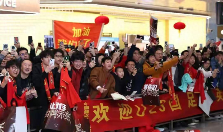 只见,在接机现场,中国龙之队球迷会球迷为了抒发对此次获取好成绩的U23国足的扶持和饱读吹,有益克己了一条长9米、宽60厘米的红色巨型横幅,上头写着“接待U23国足的豪杰们回家”的字样。