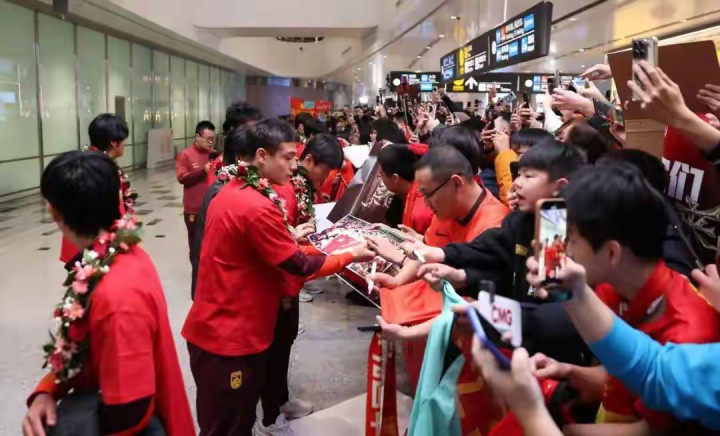 成百上千名球迷身穿国度队红色球衣、手捏鲜花来到机场接待小将们的获胜。