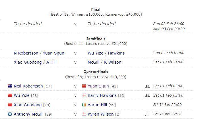 两场比赛的具体对阵为:凯伦·威尔逊VS安东尼-麦克吉尔、肖国栋VS亚伦-希尔。第二阶段则有袁念念俊、吴宜泽两位中国选手出战体育赛事直播,其中,袁念念俊的敌手是80后第一位大满贯得主“墨尔本机器”尼尔-罗伯逊。这个阶段的两场比赛具体对阵为:袁念念俊VS尼尔-罗伯逊、吴宜泽VS巴里-霍金斯。期待他们的优异弘扬。